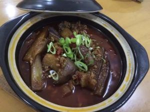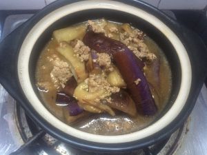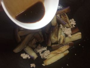 再倒入刚才过油的茄子,下点蒜米,倒入调好的酱汁,加入清水没过茄子就行,咸味已经很足了,所有不用再加盐了的