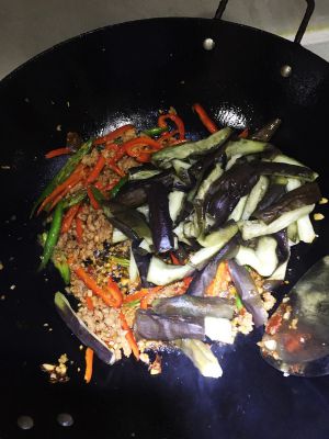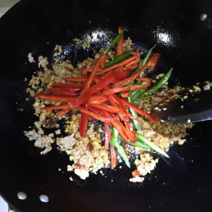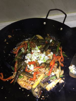 放入切好的辣椒丝,翻炒(真的特别不爱吃没熟透的辣椒,所以为了私心就先放它了。可以先放茄子,再放辣椒哦)