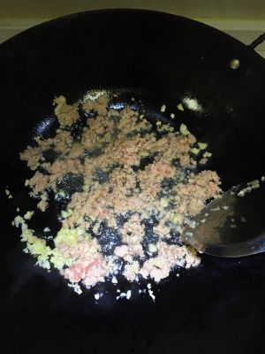 将肉末倒入锅中翻炒,加入适量料酒去腥。