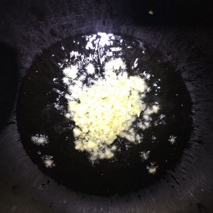 热锅热油倒入蒜末,炒香。(最近看了个文章,说油烧热了再炒菜对身体不好,建议使用热锅冷油。大家可以尝试一下)