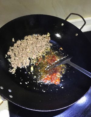 把肉末弄到一边,加入郫县豆瓣酱炒出辣油。(我比较懒哈,勤快的小伙伴也可以先把肉末铲起来)