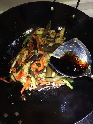 加入蒸好的茄子翻炒,再倒入调好的配料水