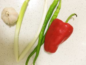 找到你需要的材料,哈哈!茄子忘了出镜,它在蒸锅里蒸桑拿呢!(选择红色彩椒是因为颜色比较好看,又富有维生素,总之吃了不是坏事。小尖椒是为了提一点点辣味。可以根据喜好选择哦!)