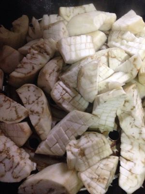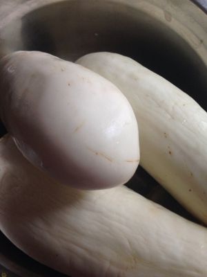 我选的是白茄子,去皮,切成网络型。
