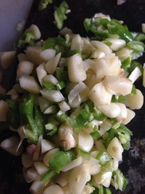 蒜和辣椒切成碎粒。