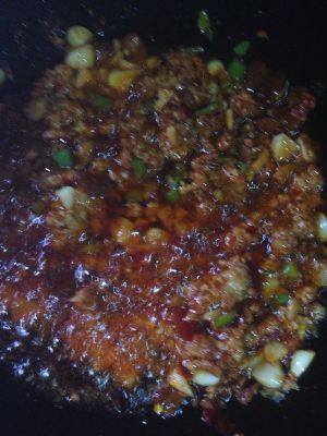 肉末炒好加豆瓣酱煸香,放入切好的蒜泥和辣椒碎,加少许盐,俩滴酱油提色,2小勺生抽,一勺黄酒。