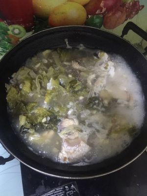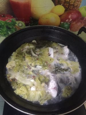 鱼汤熬好,把腌制好的鱼片放锅里,煮,不要煮的时间太长,那样鱼肉会老,煮熟即可