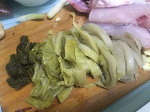 锅里放油,烧热,放入葱姜蒜末,花椒,十三香,炒出香味儿,然后把酸菜倒进去炒,然后再把鱼骨和鱼头放进去炒,加盐,酱油(也可以用豆瓣酱代替,葱伴侣啥的)