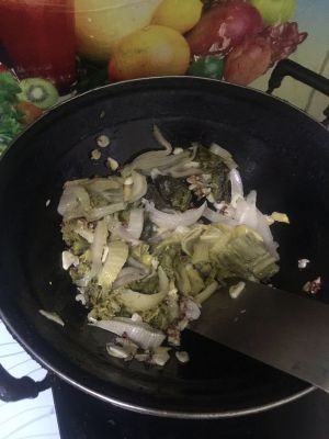 锅热油,放入切好的蒜 姜 花椒 辣椒壳 盛出来一点料,一会好的时候炝锅用, 翻炒会放入酸菜加两勺半盐,一勺鸡粉,锅里加热水,