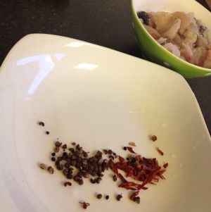 鱼加料酒,盐,胡椒,生抽,一点点淀粉,姜入味。100克油爆香花椒和干辣椒。最近忌口了所以爆的比较少哈哈。