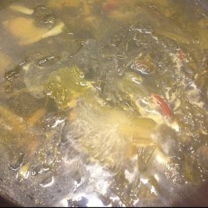 把剥下来的鱼骨用来煮一锅汤,煮沸之后放入酸菜然后加盐和鸡精,我还加了黑胡椒和一些泡椒。然后就是煮啦,差不多5分钟就可以出锅了。