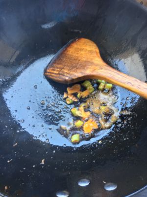 加入一勺生抽一勺老抽一勺老干妈一勺清水,翻炒均匀后盖盖,焖至收汁,撒绿葱段。