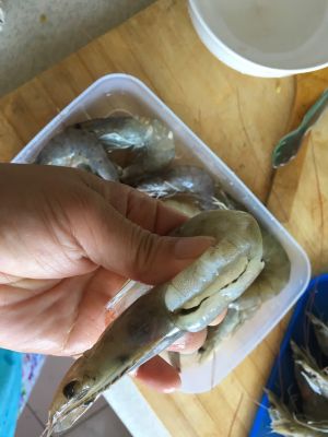 锅里放油,先把虾煎炸一下,表面发红盛出