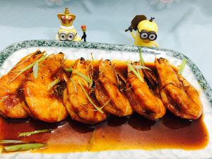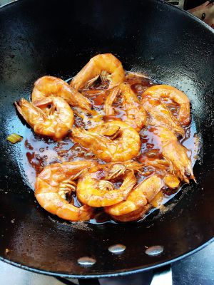 放入虾,酱油,老抽,盐少许,炒至七分熟。