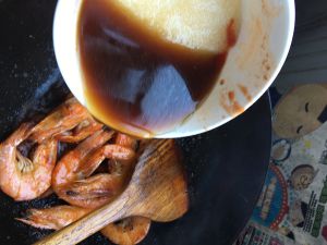 放入虾继续翻炒,然后,把糖,盐,生抽,料酒放碗里调好汁,一起倒锅里炒