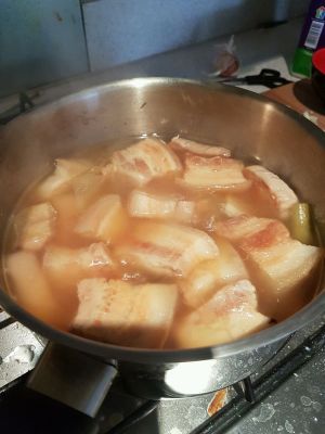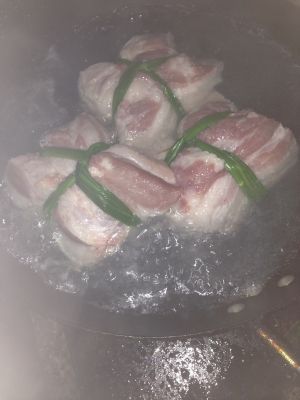 五花肉用火烤一下皮,使皮上的毛烧焦,用水冲洗干净。 五花肉放入凉水锅中,加葱、姜、料酒,大火焯到浮沫出现即可捞出洗净。