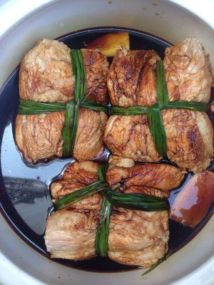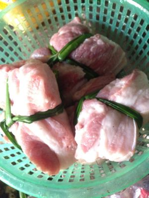 五花肉切成七八公分正方形、用稻草以十字捆扎法棒好