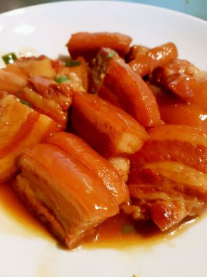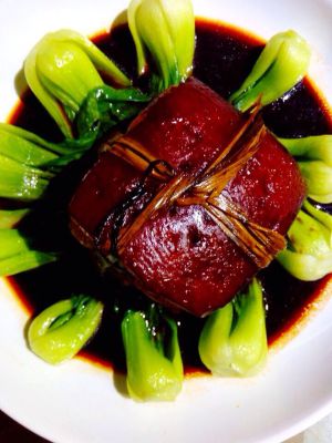 皮朝下摆好加入两勺老抽,两勺白糖,500克花雕酒,水量参照图片。若果不够在加一勺水,盖盖大火烧开转小火炖一小时后,在翻一个面在炖一小时,切忌!(小着火,少着水、火候足时它自美-苏东坡,)苏轼这句诗其含义你一定要明白,再煮一小时拿出来用牙签在皮上扎无数个空一定要深,再放在蒸锅里大火蒸半小时,千万不要放盘子,要不然油会走不掉,直接放在蒸板上就好了,最后把小青菜汆汤摆盘把剩余的汁浇上就好了