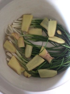 大葱切断,生姜切片铺底,大葱用小葱代替最好