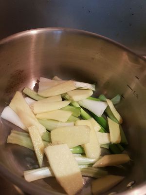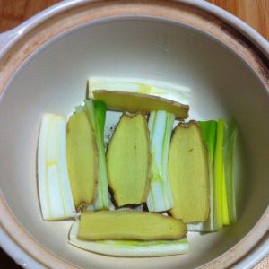 砂锅底下刷一层油,砂锅里面四周也要刷到。 铺上厚厚一层香葱,上面铺一层姜片。
