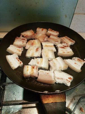 五花肉汆水后,冷水洗净肉表面的血渣。入锅中火煎到两面稍微焦黄。