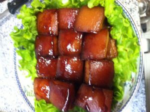 肉煨至将熟时将肉块翻转,皮向上继续收汁使瘦肉部分入味。其间取空盘用生菜打底备用