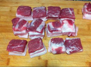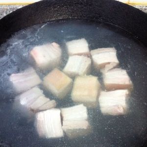 五花肉切3厘米左右的正方形大块,凉水入锅撇去浮末,捞出备用。
