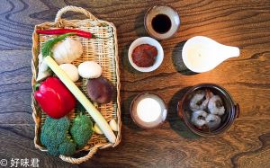 凤尾虾背开去虾线,西兰花切成小朵,口蘑1开4(根据蘑菇大小) 香菇1开6,蒜顶刀切片,姜切成细丝和姜末,香茅切碎,美人椒切碎。将姜丝,辣椒丝,刁草泡入冷水里待用。(装饰用)