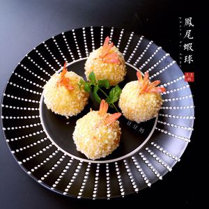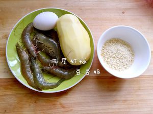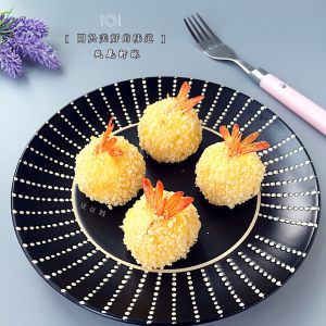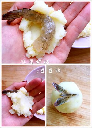 鲜虾去头微挑去虾肠留尾巴,用盐和胡椒粉腌制10分钟。取适量的土豆泥,放在中间一个只虾,再盖上一点土豆泥,用手团成圆球