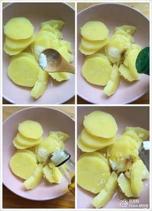 煮熟的土豆片家少许盐、胡椒粉、亚麻籽油压泥拌匀。