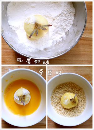 然后准备好面粉、鸡蛋液、面包糠,把最好的虾球分别沾上面粉、蛋液、面包糠