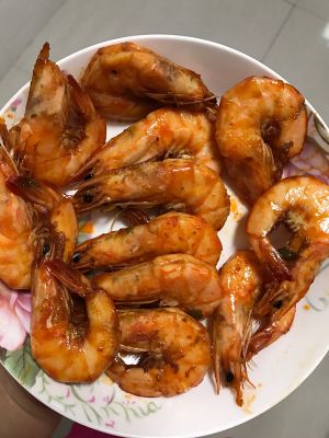 放虾炒至两面变红,加入酱油一小勺,白糖半勺,少许盐,用铲子按压虾头会有虾油出来,味道更鲜美