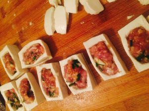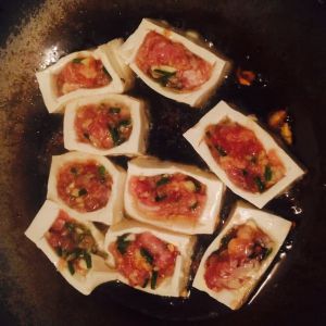 先把豆腐切块,用小勺在中间挖个洞,将肉末装进豆腐中间,下油锅煎至五成熟,出锅。