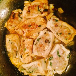 热锅,下油,小火慢煎金黄至熟。加入酱油,蚝油,五香粉,水淀粉勾芡,装盘