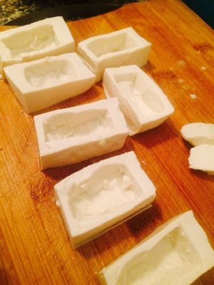 豆腐切成稍微略厚的块状,挖去中间部分。待用…