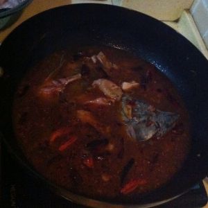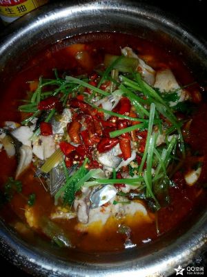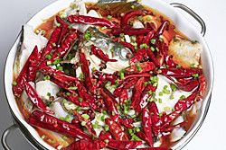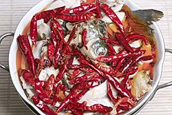 煮熟之后,把鱼倒入盆里。洗锅烧热油,在鱼表面撒花椒,干辣椒,把热油淋上去就大功告成了。