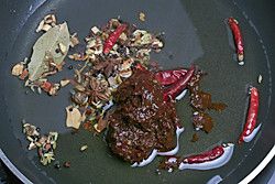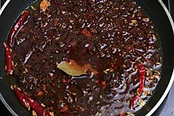 先制作水煮鱼好吃必须的老油,外面饭馆都各自掌握的秘诀就在这里:先将锅做热放少许油小火煸香小茴香、八角、豆蔻、山奈、香叶、桂皮、干辣椒等香料然后放入辣椒酱。