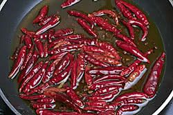用老油慢火将干辣椒和花椒或者麻椒炸出香味。