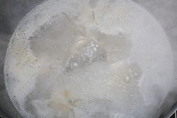 倒入开水很快鱼汤就变白了,撇去浮沫。