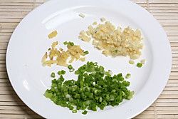 将葱、姜、蒜切细末备用。