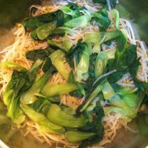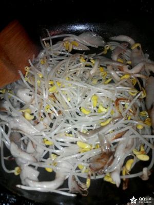 利用锅里的残留底油将黄豆芽煸炒出少许水份。