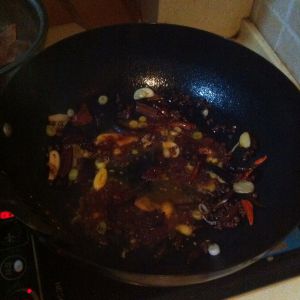 另起一锅倒油,放入八角,香叶,灯笼椒,葱片,姜片,一块火锅底料,一大勺郫县豆瓣酱,一小勺干锅酱炒香