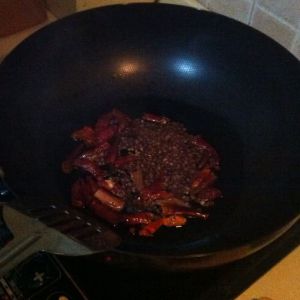 锅内油热后将火调小,放入辣椒等煸炒(调小火是为了不让辣椒被炒糊了)