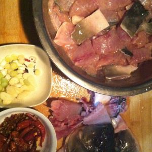 将片好的鱼片用盐、五香粉、料酒和淀粉腌上(我做的鱼不是片的特别薄的那种,鱼刺也没有彻底分开,吃起来比较有鱼的感觉~),准备好干辣椒、麻椒、葱姜蒜、桂皮、八角,大块的鱼头鱼骨备用