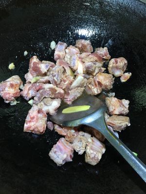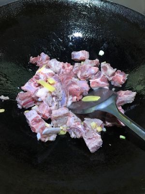 锅中放入油,七成热时将冰糖放入锅中炒出糖色,将排骨倒入锅中翻炒,炒到排骨表面有糖色,放一勺料酒,一勺生抽,一勺老抽,陈醋,继续翻炒,炒到表面上色。