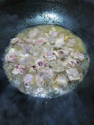 翻炒至排骨有点发白时,倒入酱汁,拌匀