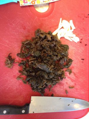 在腌制肉的期间,把梅菜捞出,洗净,切小块。也把蒜瓣切片。