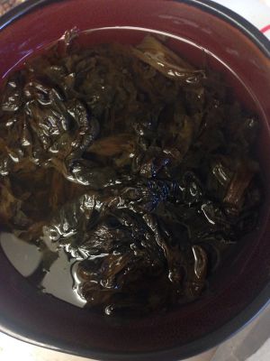 盐、蚝油、料酒、水、老抽、生抽、白糖调碗汁儿备用。油锅下姜蒜炝锅,下梅干菜略炒,稍微炒一下,倒入碗汁儿,小火焖5分钟后,称出来备用