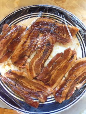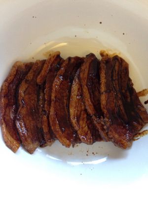 泡发梅菜~我的梅菜用量没有写很清楚,其实这个不严格,只要泡发切碎以后能铺满肉片就够了。我的是超市买的已经腌制好的梅菜,所以味道太重(还是新鲜的或者菜市场卖的好)我在泡开的过程中还加入了一汤匙的白糖,腌制10-15分钟。可以利用这段时间准备下面两个步骤