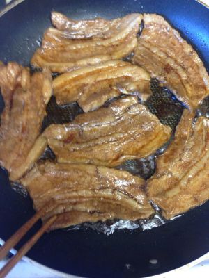 锅里可适量多倒一点油,加热至7成油温。把刷过酱的肉,肉皮朝下,入锅炸。(这个时候比较容易受伤,因为肉里含有大量水份,会到处嘣油,我是左手拿锅盖当盾,右手用铲子铲住扔到了油锅里。)